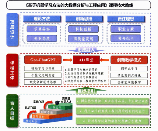 《基于机器学习方法的大数据分析与工程应用》创新“AI+思政”育人范式,开发专业智能教学助手,将机器学习技术与“双碳”目标、灾害预警等国家需求结合,培养学生数据赋能工程的创新能力与社会责任。