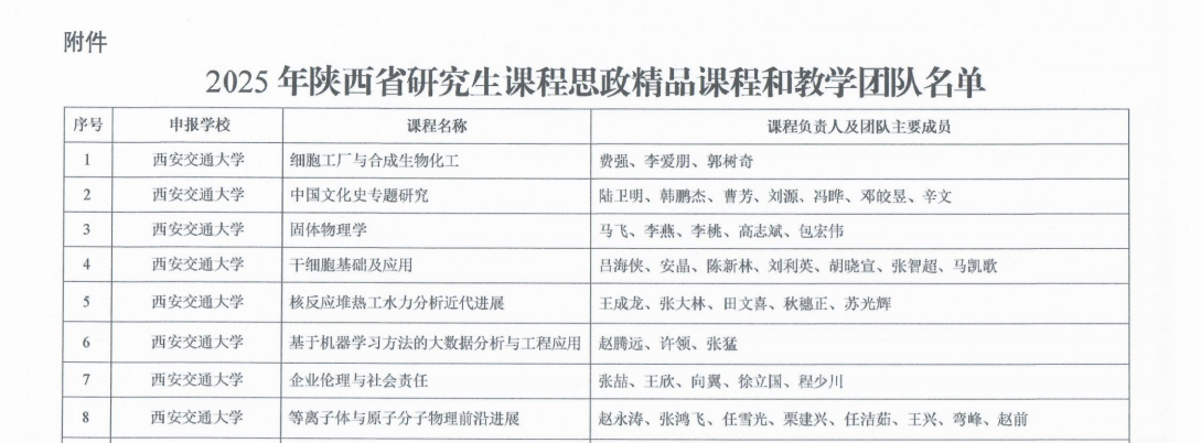 日前,陕西省教育厅公布了2025年省级课程思政精品课程认定结果,西安交通大学共有8门研究生课程及其教学团队成功入选,至此,学校累计获批国家级研究生课程思政精品课程1门、省级精品课程26门,位列陕西省第一。