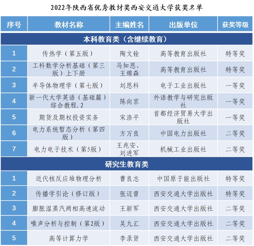 近日,陕西省教育厅发布了《陕西省教育厅关于公布2022年陕西普通高等学校优秀教材获奖名单的通知》(陕教函〔2023〕111号),西安交大12部教材获2022年陕西省优秀教材奖,其中特等奖4项、一等奖3项、二等奖5项,获奖数量居全省第一。