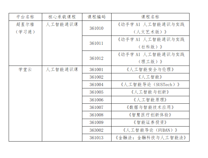本次共引进13门线上人工智能课程,分别在超星尔雅(学习通)与学堂云两大平台开展,具体课程对应平台见下表: