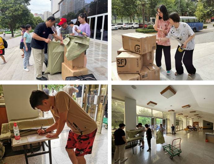 按照统一部署,研工部组织学生志愿者在思源活动中心发放行李编织袋,汇总学生需求;后勤保障部把握学生具体需求,制订详细工作方案,根据学生所在学院对行李存放地点进行划分,精心安排行李标贴、行李编号等以便学生在创新港入学后就近提取,提供了全流程针对性闭环服务;各学院在创新港巨构确定暑期行李寄存地点,组织志愿者参与行李搬运工作,让学生在志愿服务中提升劳动教育获得感。