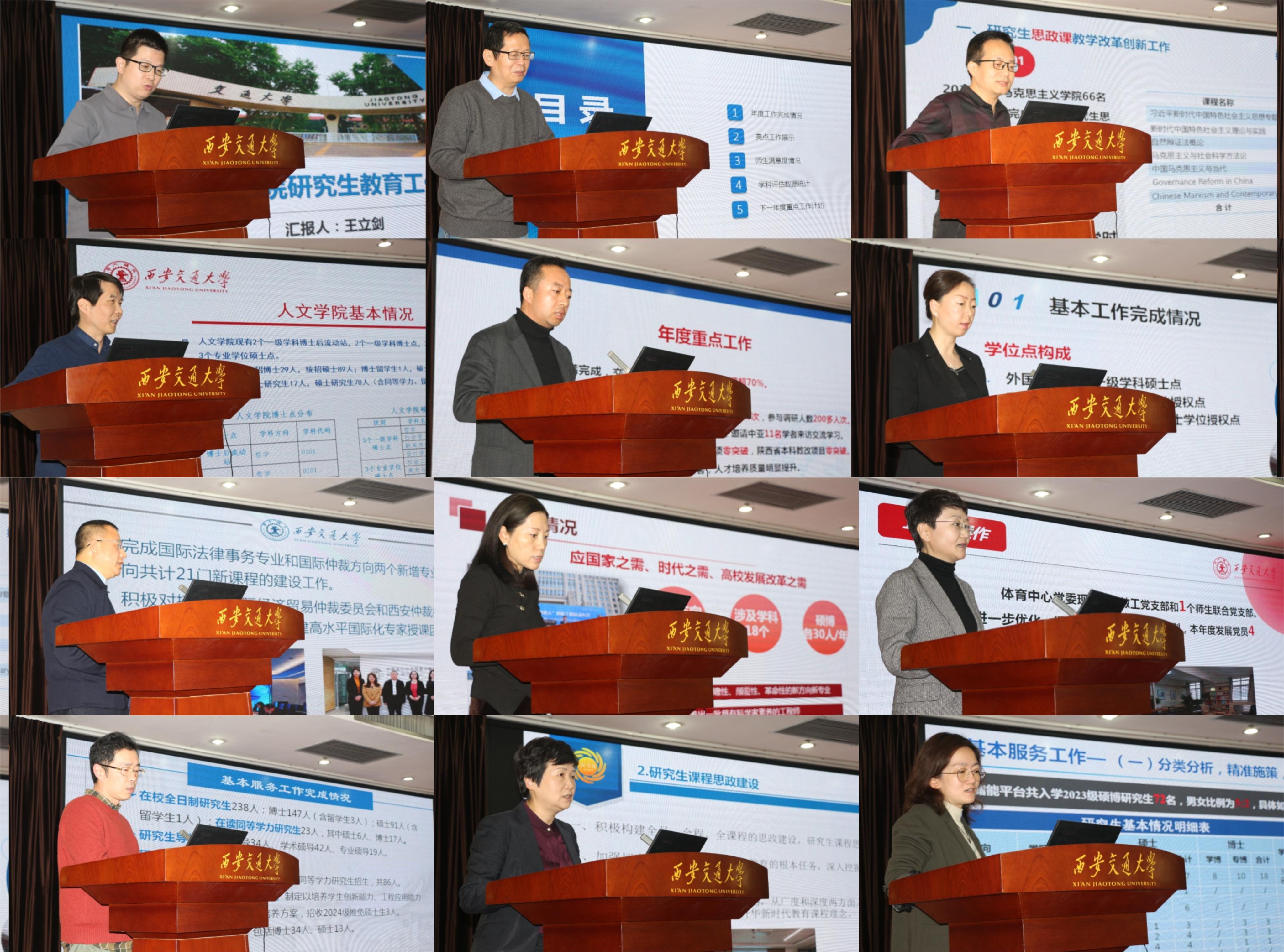 会议交流环节,由图书馆、研究生院(研工部)等管理服务部门与28个研究生教学科研单位依次围绕研究生工作完成情况、创新性工作举措与成效、指标性数据完成情况以及下一年度重点工作规划等方面进行汇报并开展互评。