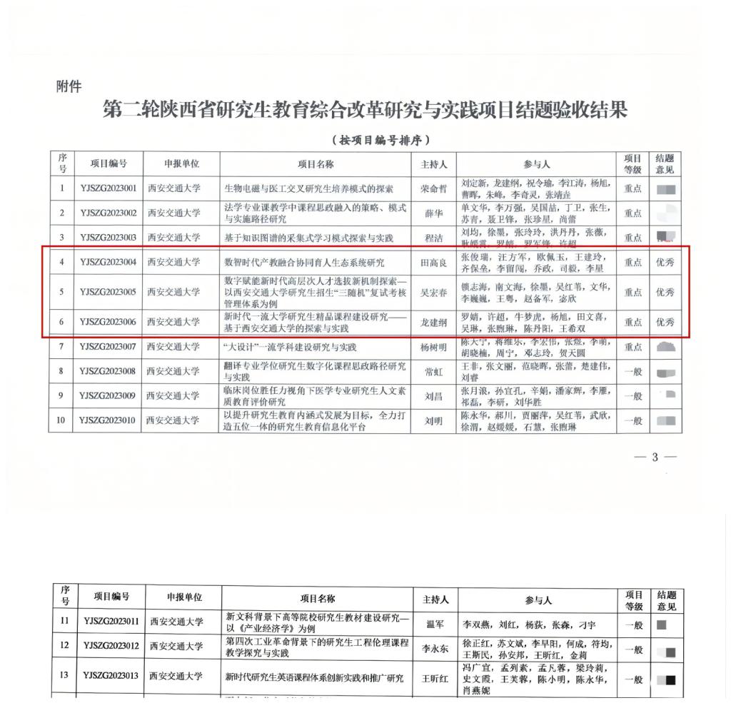 近日,陕西省教育厅、省学位委员会公布了第二轮陕西省研究生教育综合改革研究与实践项目结题验收结果,全省147个项目中共评出“优秀”项目24项,西安交通大学3个重点项目获评“优秀”,并列全省研究生培养单位第一位。