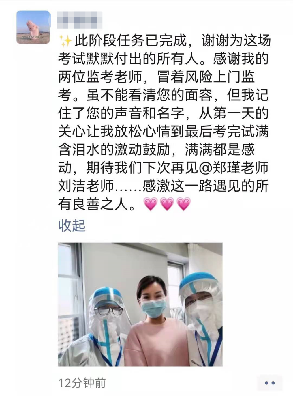 “感谢为这场考试默默付出的所有人,感谢我的监考老师冒着风险上门送考,虽不能看清您的面容,但我记住了您的声音和名字……”这是一位报考西安交通大学的考生在送考上门结束后,满含感情发出的一条朋友圈,配图是她与两位身穿防护服的监考老师的合影。