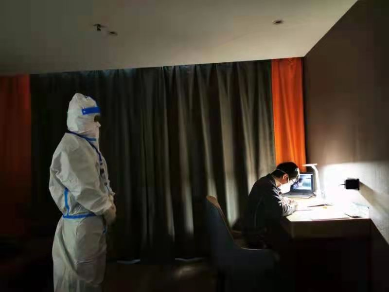 穿上防护服,深入隔离酒店监考是一种怎样的体验?汪老师说,穿过防护服,就更敬佩“大白”们了,他们真的太辛苦了。“穿着防护服只感到透不过气的那种闷,水汽打湿口罩和面罩,视线会变得模糊,还有一种缺氧、整个人反应变慢的感觉,到了下午,我几乎看不清和我一起监考的孙卫老师了。”成为“大白”监考的独特经历,已深深镌刻在28位监考老师脑海中。