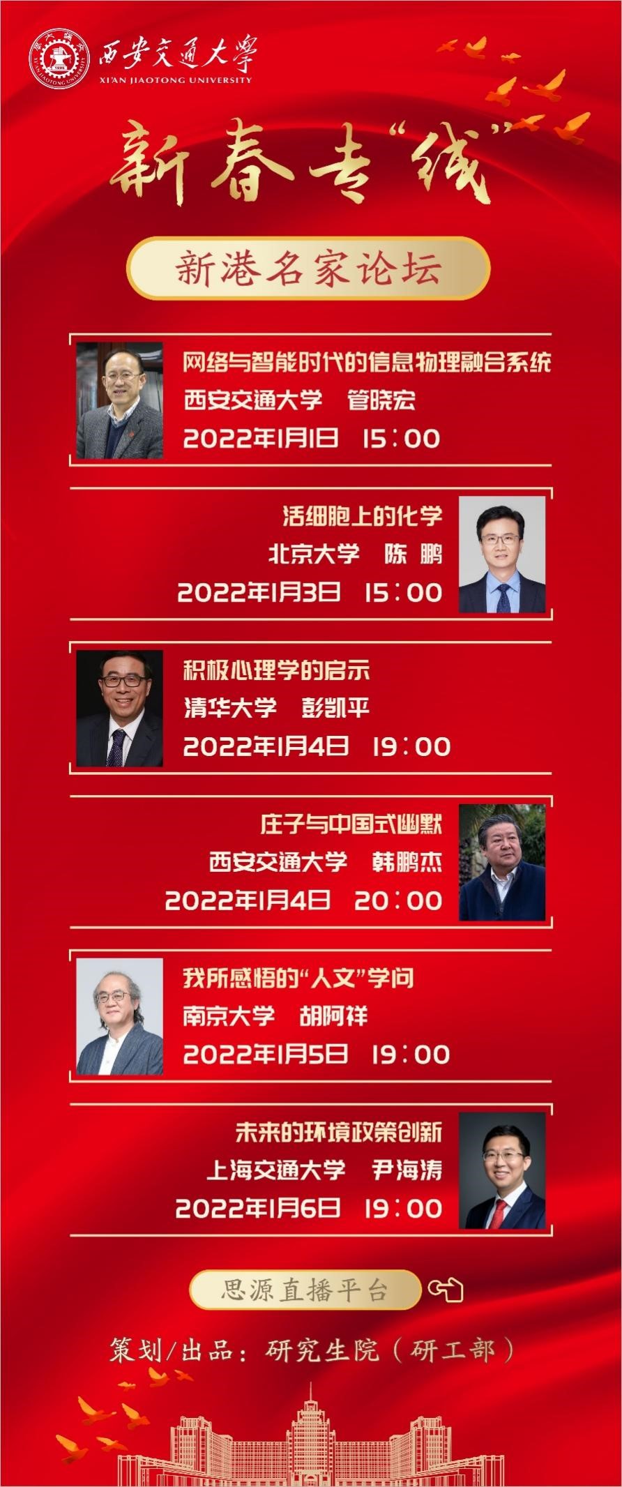 新港名家论坛——新春专“线”系列讲座在线直播地址:https://zhibo.xjtu.edu.cn/live-show-detail/258。场次设置如下,欢迎广大师生观看。