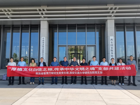 5月30日下午,为推动主题教育扎实开展,深刻领悟中华优秀传统文化的独特魅力,增强文化自信,促进我省研究生教育工作更好开展,陕西省教育厅研究生处与西安交通大学研究生院赴西安国家版本馆开展党支部联合党日活动。本次活动围绕“厚植文化自信之根,传承中华文明之魂”主题展开深入学习与交流。省委教育工委、省教育厅一级巡视员袁宁,省教育厅研究生处处长、省学位办主任张和平,西安交大研究生院常务副院长、党支部书记吴宏春,研究生院副院长、党委研工部部长薛周利以及双方10余位党员干部代表参加活动。研究生院党支部书记吴宏春主持活动。